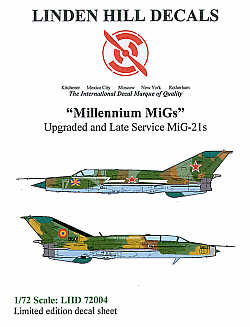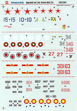 Mikoyan MiG-21 (13) SM White 17 USSR 1st Sqn 1984; bis Blue 15 USSR 115th Guards Fighter Regt. 1985; UM Blue 10 Research Institute 1995; UM White 34 Bulgarian Air Force 1997; bis White 90 Bulgarian Air Force; bis White 345 Bulgarian Air Force 2000; UM Red 27 Georgian Air Force 2001; Chengdu J-III Red 30163 PLAAF China 1999; Lancer B Black 9501 Romanian Air Force 2000; MF Red 901 Romanian Air Force; Lancer A Black 810 Romanian Air Force 2001; Lancer C Black 6607 Romanian Air Force 2000; UM Red 6906 Romania Air Force 1997 Manufacturer: Linden Hill Code Number: LHD72004 Scale: 1:72 Item type: Aircraft decals (military) Price: