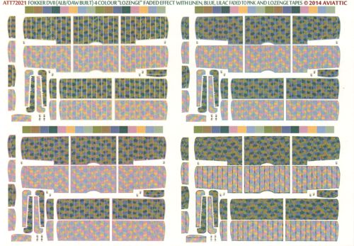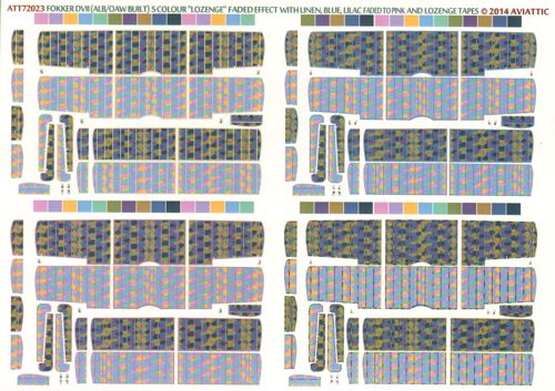 Aviattic - ATT72023 - 1:72 | Fokker D.VII (alb/oaw built) 5 colour lozenge faded effect with linen, blue, lilac faded to pink and lozenge tapes (x4) More | Aircraft decals (military) | Catalogue | £16.00 | ||