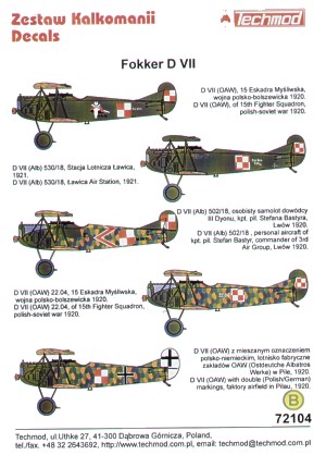 Techmod - TM72104 - 1:72 | Fokker D.VII in Polish service 1920/21 (5) 15 FS; Lawica Air Station; CO 3rd Air Group; Variety of lozenge camouflage schemes More | Aircraft decals (military) | Catalogue | £5.40 | ||