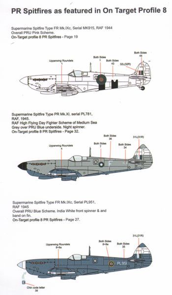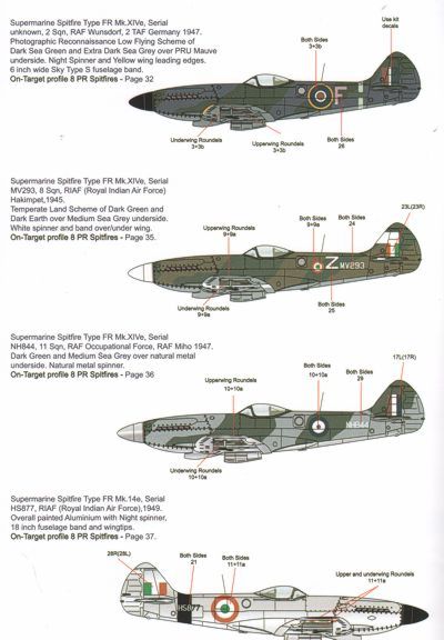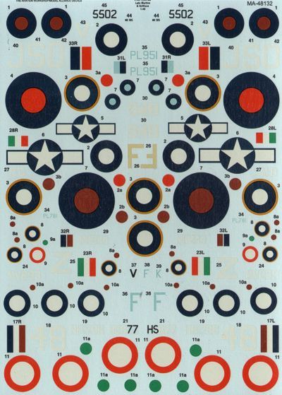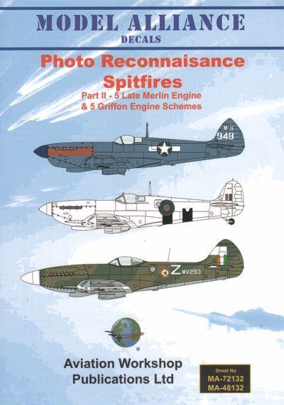 Photo Reconnaissance Merlin/Griffin engine Supermarine Spitfire Part 2. (10) MK915; SAAF 5502 SD-J; PL781/F; PL951; MB948 USA Air Force; F 2 Sqn RAFG 1947; MV283/Z Royal Indian Air Force; NH844 11 Sqn; MV786 /48 India; HS877RIAF 1948 Manufacturer: Model Alliance Code Number: ML48132 Scale: 1:48 Item type: Aircraft decals (military) Price:
