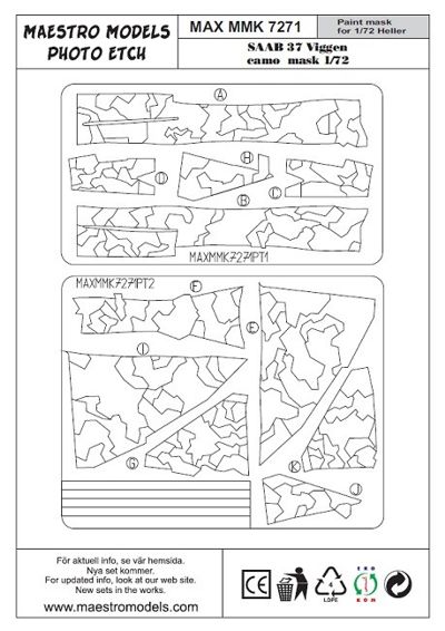 Saab JA-37 'Viggen' 1-seater splinter camouflage pattern paint masks [AJ-37 JA-37] (designed to be used with Heller and Tarangus kits) Manufacturer: Maestro Models Code Number: MMMK7271 Scale: 1:72 Item type: Aircraft paint masks (self adhesive) Price: