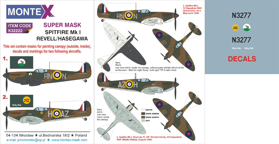 Supermarine Spitfire Mk.I (canopy frame paint masks (inside and outside)) insignia and markings masks + decals (designed to be used with Hasegawa kits)