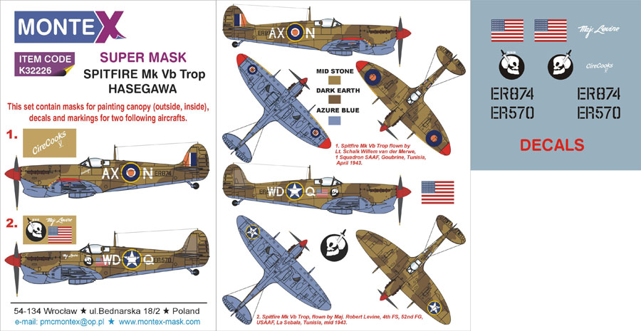 Supermarine Spitfire Mk.Vb Trop (canopy frame paint masks (inside and outside)) insignia and markings masks + decals (designed to be used with Hasegawa kits)