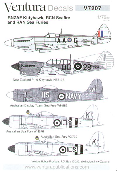 Ventura - VA7207 - 1:72 | Revised and Re-printed! Curtiss P-40 Kittyhawk, Supermarine Seafire Mk.XV, Hawker Sea Fury FB.11 (5) Curtiss P-40 NZ3136 OD-28 4 OTU NZ 1945; Supermarine Seafire Mk.XV PR434 AA-C 833 Sqn R Canadian Navy; Sea Furies RAN WH589 No 115 Australian Display Team overall Oxford blue; WH676 138/K; VX730 109/K. Both 805 Sqn HMAS Sydney Korea More | Aircraft decals (military) | Catalogue | £5.99 | ||