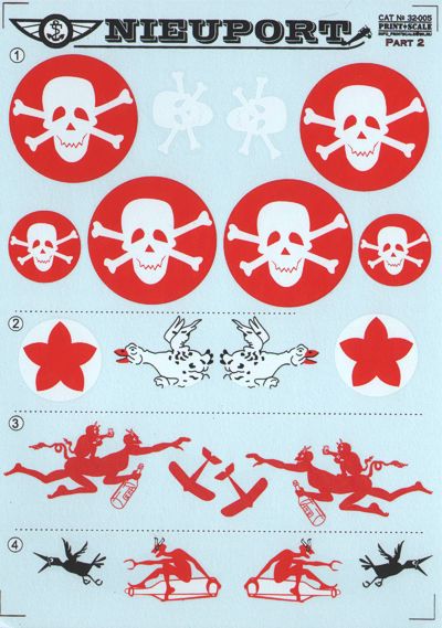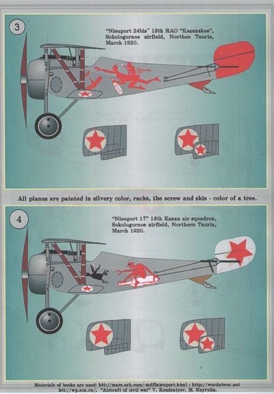 Nieuport N.23/N.24 Part 2 (4) Moscow Air School with duck on fuselage; 1st Air Sqn Norther Front 1918 with Skull and Cross Bones markins, both mounted on Skis; 13th RAO with Devil on fuselage; 13th Kazan Air Sqn with Devil and bird on fuselage. Both Northern Tauria 1919.