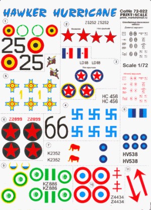 Hawker Hurricane (11) Black 25 Belgian; Z5252 White 01 Russia; LD118 White A Yugoslavia; HC 456 Black 6 Finland; Yellow 1; Z2899; K2352 A-A SEAC; HV538 White B SEAC; KZ886 White A Egypt; Z4434 France.