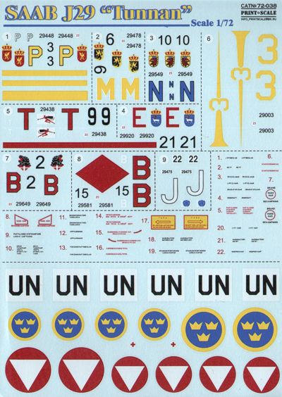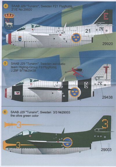 Saab J-29A 'Tunnan' (9) Sweden No 29448 3/P F2 Sqn; No 29478 6/M F6 Sqn; 29549 10/N F10 Sqn; 29920 21/E F21 Sqn; 29438 9/T, 29581 15/B 15 Sqn, all overall gloss aluminium. 29003 3/3 Olive green; Austria 29649 2/B gloss aluminium; 29475 22/J UN camouflaged.