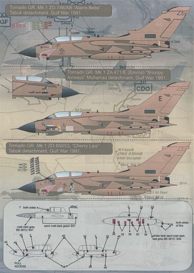 Panavia Tornado GR.1 Gulf War Nose Art on Desert Pink aircraft. (11) ZD892/H 'Helen/Snoopy Airways'; ZA374/AF 'Angel Face'; ZA844/DE 'Donna Ewin'; ZD890/O 'Hello Kuwait G'Bye Iraq'; ZA447/EA 'Mig Eater' with Shark mouth; ZA465/EA 'MiG Eater' with Shark mouth; ZA739/AC 'Armoured Charmer'; ZA748/AK 'Anola Kay'; ZD746/AB 'Alarm Belle' with Shark mouth; ZA471/E 'Emma' Snoopy Airways; ZD850/CL 'Cherry Lips' with Shark mouth.
