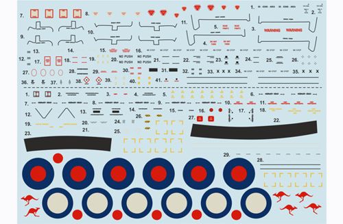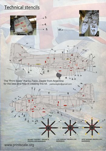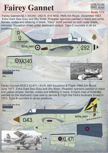 1. Fairey Gannet AS.1 XA340 / 292-R, 815 NAS, H.M.S. Ark Royal, December 1957. Extra Dark Sea Grey and Sky finish. Propeller spinners painted in black and white. Serials, codes and lettering in black. 'Harp' motif painted on both outer finlets, mirrored. Squadron chest under starboard cockpit. Type D roundels in all six positions.