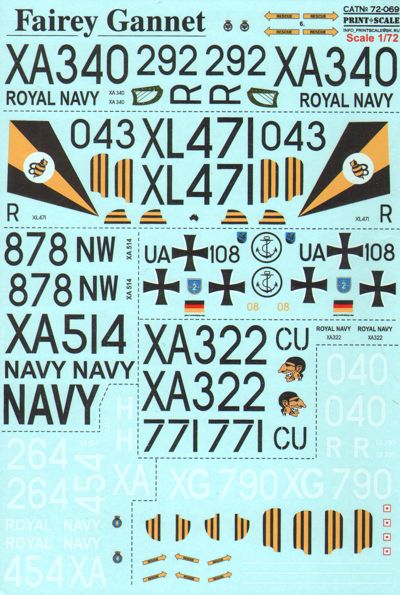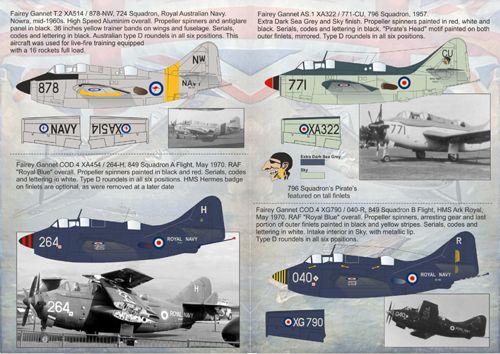 5. Fairey Gannet AS.1 XA322 / 771-CU, 796 Squadron, 1957. Extra Dark Sea Grey and Sky finish. Propeller spinners painted in red, white and black. Serials, codes and lettering in black. 'Pirate's Head' motif painted on both outer finlets, mirrored. Type D roundels in all six positions.
