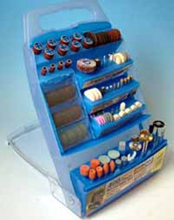 400 various mini accessories for use with all Mini Rotary Modelling tools. Shaft diameters up to 3.2mm. Includes accessory listing and usage details with recommended maximum speeds. Excellent storage case. For drilling, polishing, cleaning, DeRusting, DeBurring, engraving, cutting, carving, hollowing, sanding and shaping wood, plastic, fibreglass, metal and stone