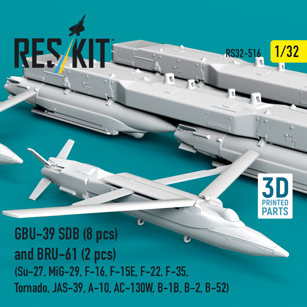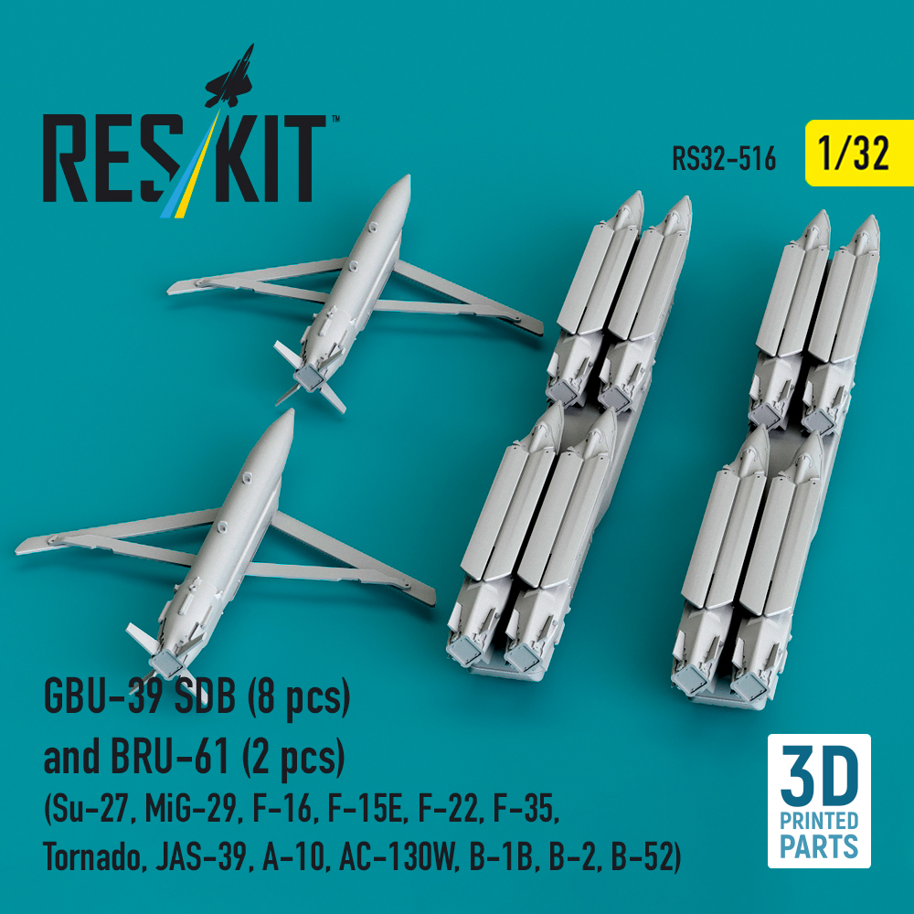 GBU-39 SDB (8 pcs) and BRU-61 (2 pcs) (Su-27, MiG-29, F-16, F-15E, F-22, Lockheed-Martin F-35, Tornado, JAS-39, A-10, AC-130W, B-1B, B-2, B-52) (3D Printed) Manufacturer: ResKit Code Number: RS32-0516 Scale: 1:32 Item type: Aircraft detailing sets (resin) Price: £24.60 £22.14 (Put this on Backorder and save 10%!) Order Quantity: Availability: