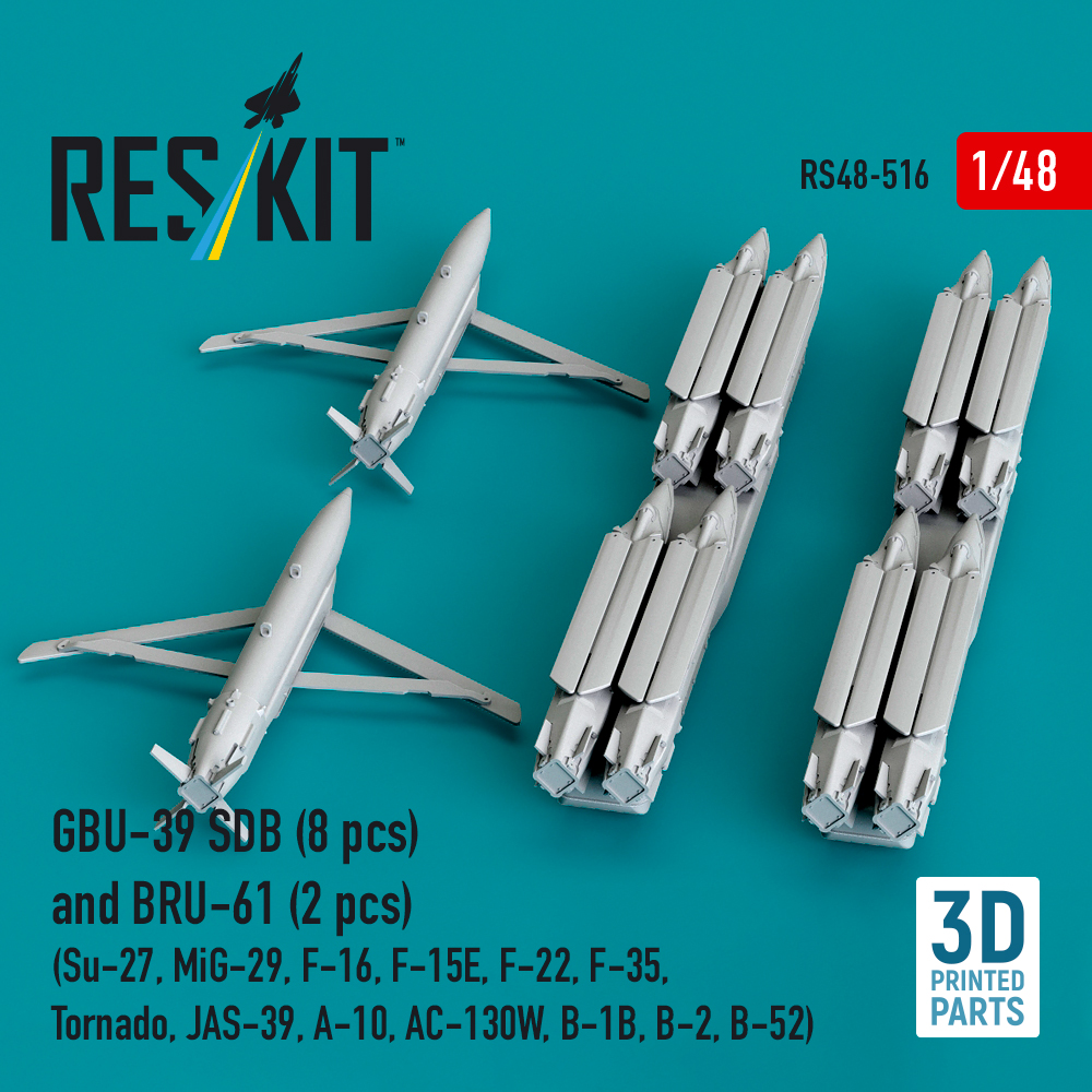 GBU-39 SDB (8 pcs) and BRU-61 (2 pcs) (Su-27, MiG-29, F-16, F-15E, F-22, Lockheed-Martin F-35, Tornado, JAS-39, A-10, AC-130W, B-1B, B-2, B-52) (3D Printed) Manufacturer: ResKit Code Number: RS48-0516 Scale: 1:48 Item type: Aircraft detailing sets (resin) Price: £19.20 £17.28 (Put this on Backorder and save 10%!) Order Quantity: Availability: