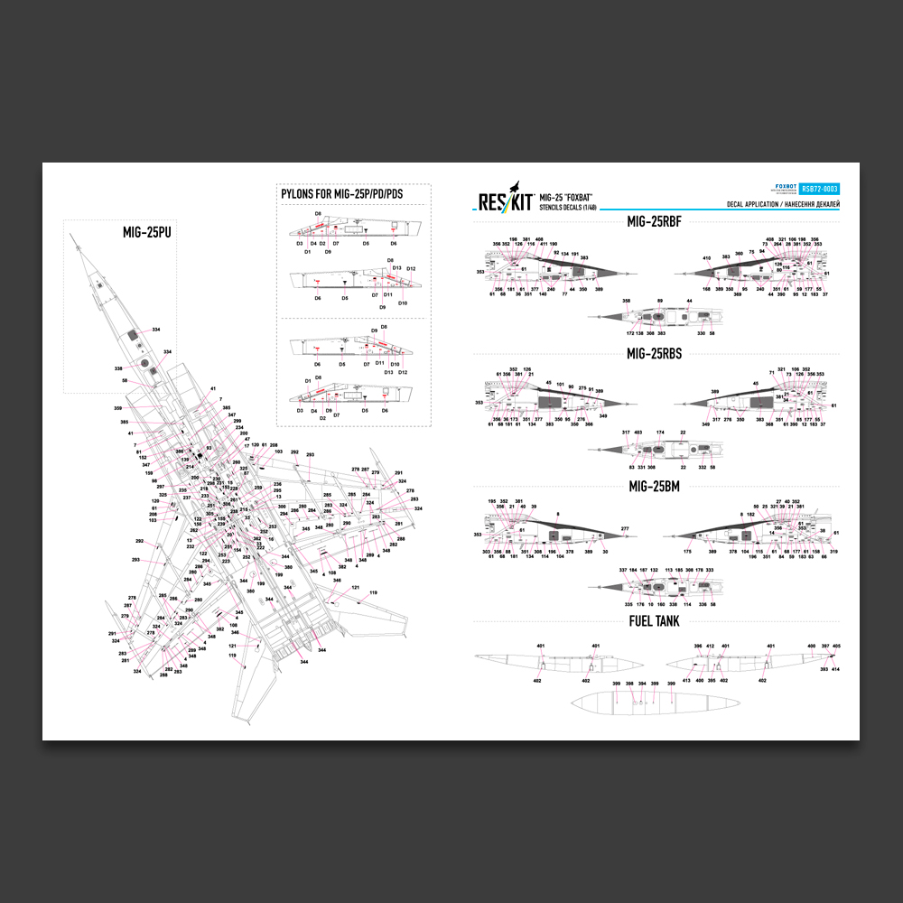 MiG-25 "Foxbat" Stencils Decals Manufacturer: ResKit Code Number: RSB72-0003 Scale: 1:72 Item type: Aircraft decals (military) Price: £15.20 £13.68 (Put this on Backorder and save 10%!) Order Quantity: Availability: