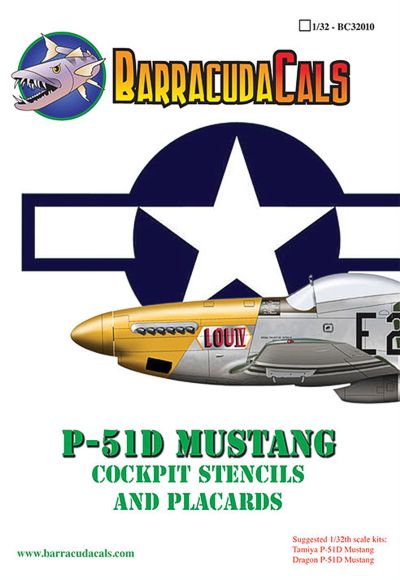 Barracuda Studios - BC-32010 - 1:32 | Re-printed! North-American P-51D Mustang Cockpit Stencils and Placards. This sheet provides a complete set of stencils and placards for the cockpit of the North-American P-51D. Over 100 tiny decals recreate the extensive markings found in the cockpit, from the North-American Data Plates down to the tiny PULL marking on the drop tank release handle. Instrument faces are not included, but everything else is. Even the battery and radios behind the seat bulkhead are covered in this set. Most stencils are readable and accurately recreate the real markings. A simple but spectacular upgrade for the Mustang's large and highly visible cockpit. Designed for the Tamiya kit, but will work with just about any 1:32nd scale North-American P-51D. More | Aircraft decals (military) | Catalogue | £8.50 | ||