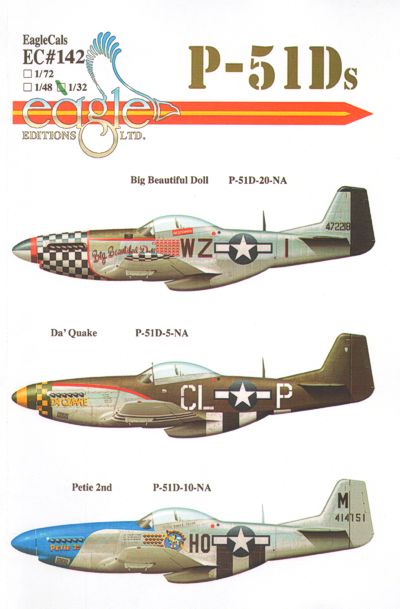 Eagle Cal - EAG32142 - 1:32 | Re-printed! North-American P-51D Mustang Part 4 (3) 44-72218 WZ-I 78th FG Col. John Landers 'Big Beautiful Doll' RAF Duxford; 44-13954 CL-P 55th FG LT Col John L. McGinn 'Da Quake'; 44-14151 HO-M 352nd FG Lt Col John Myer 'Petie 2nd' RAF Bodney More | Aircraft decals (military) | Catalogue | £24.99 | ||