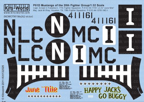 Kits-World - KW132026 - 1:32 | North-American P-51D Mustang 20th FG (2) 44-11161 LC-N 77th FS Capt. Ernest C Fiebelkorn 'June Nite'; 44-13761 MC-I 79th FS Maj Jack M Ilfrey. P-51D 'Happy Jacks Go Buggy' More | Aircraft decals (military) | Catalogue | £10.20 | ||