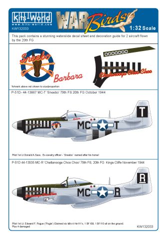 Kits-World - KW132033 - 1:32 | North-American P-51D Mustang 44-13535 MC-R 'Chattanooga Choo Choo' 79th FS, 20th FG November 1944 North-American P-51D- 4413667 MC-T 'Sneebo' 79th FS 20th FG October 1944 More | Aircraft decals (military) | Catalogue | £10.20 | ||