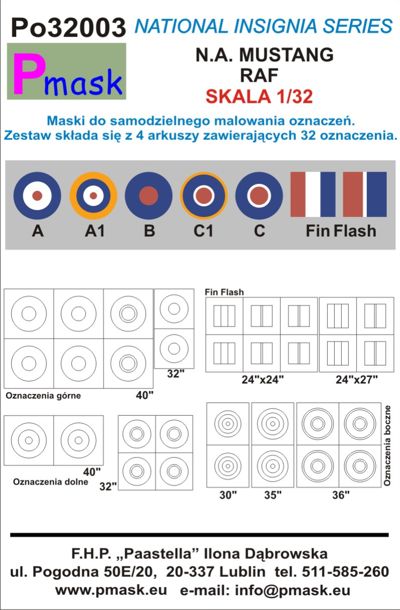 Pmask - PO32003 - 1:32 | North-American P-51D Mustang RAF National Insignia paint masks (most masks suitable for many other aircraft) (designed to be used with Revell, Tamiya and Trumpeter kits) More | Aircraft paint masks (self adhesive) | Limited Availability | £6.75 | ||