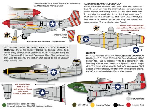 Zotz - ZTZ32037 - 1:32 | North-American P-51D Mustang (3) 44-14626 118th TRS/23rd FG Lt.Col. Edward O.McComas CO, China 1945; 44-15459 HL-B 308th FS/31st FG 'American Beauty/Lovely Lila' Capt John Voll MTO 1944; 44-72366 IV-D 369th FS/359th FG 'Hubert' Capt Rene L.Burtner Jnr, Green nose RAF East Wretham 1944 More | Aircraft decals (military) | Limited Availability | £24.99 | ||