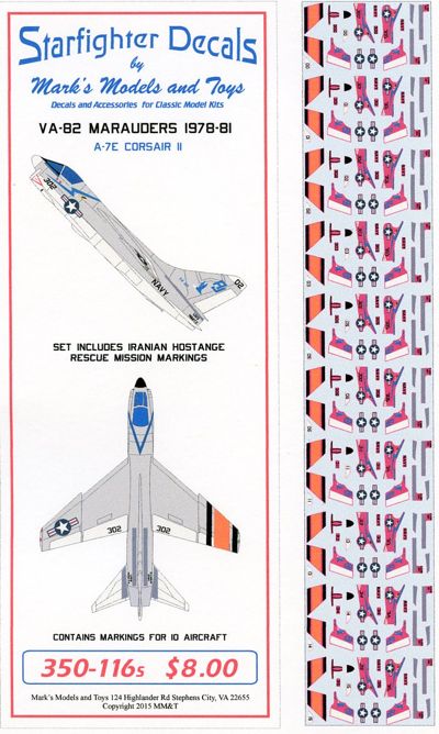 VA-82 Marauders. First time this unit has been released with the correct markings. Set contains markings for 9 aircraft from VA-86 from CVW-8 from 1977-81. Also contains markings for a pair of Drop Tanks and special recognition markings for the Iranian Rescue Mission. For use with any 1/350 LTV A-7E Corsair kit. Manufacturer: Starfighter Decals Code Number: SFD350116 Scale: 1:350 Item type: Aircraft decals (military) Price: