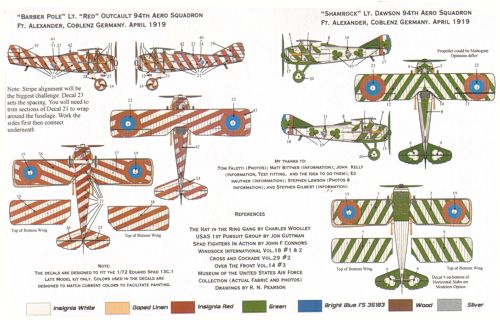 Spad 13.C.1 AEF Showbirds (2) Barbers Pole covered with Red Stripes all over; Shamrock Green Stripes on wings and nose, shamrocks on fuselage. Both 94th Aero Squadron, Coblenz, April 1919. White 36 35th PG; 33-541 Red 1 24th PG; White 10 Skylarks Aerobatic Team; White 1 8th PG Langley Field . [XIII]