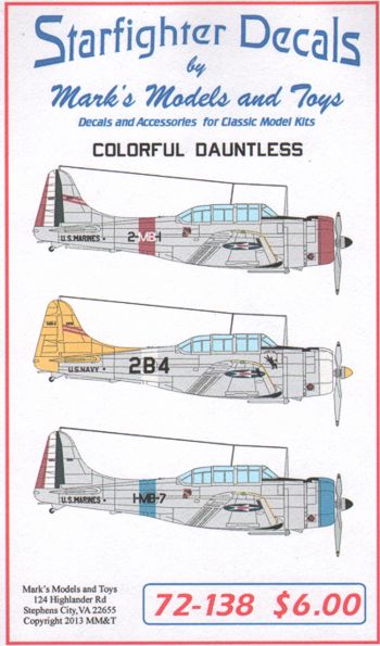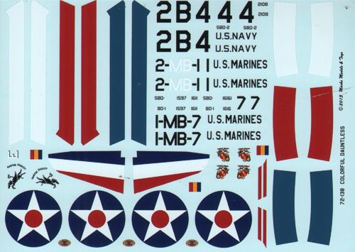 Colorful Dauntless Decals for 3 different Douglas SBD-1 Dauntless and Douglas SBD-2 Dauntless aircraft. Markings are for 'Yellow Wing' SBDs serving with the USN and USMC in 1941. Manufacturer: Starfighter Decals Code Number: SFD72138 Scale: 1:72 Item type: Aircraft decals (military) Price: