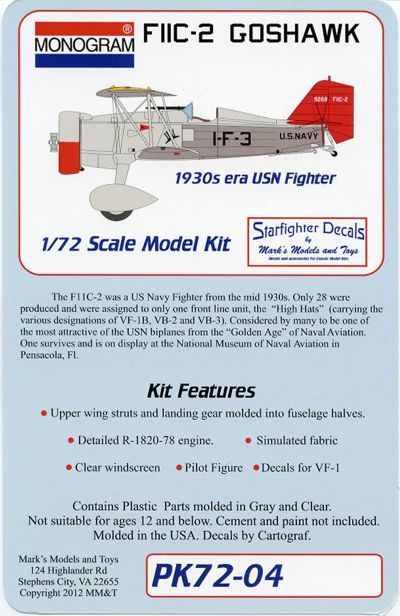 Curtiss F11C-2 Goshawk A 2013 re-issue of the 1/72 Monogram 1930's era Biplane kit that had been out of production since the mid-1970s