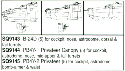 Consolidated PB4Y-1 Privateer canopy, nose, mid-upper and tail turret (designed to be used with Matchbox and Revell kits) Manufacturer: Squadron Canopies Code Number: SQS9144 Scale: 1:72 Item type: Aircraft canopies (vacform) Price: