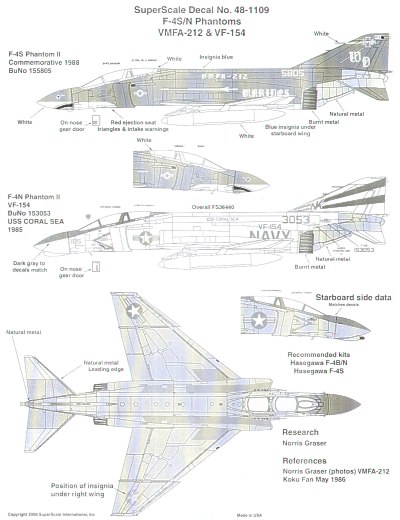 McDonnell F-4N/S Phantoms (2) N 153053 NK/105 VF-154 Black Knights USS Coral Sea 1985 low-vis; S 155805 WD/00 VMFA-212 1988 Commemorative scheme Insignia blue uppersurface over white, shark mouth.