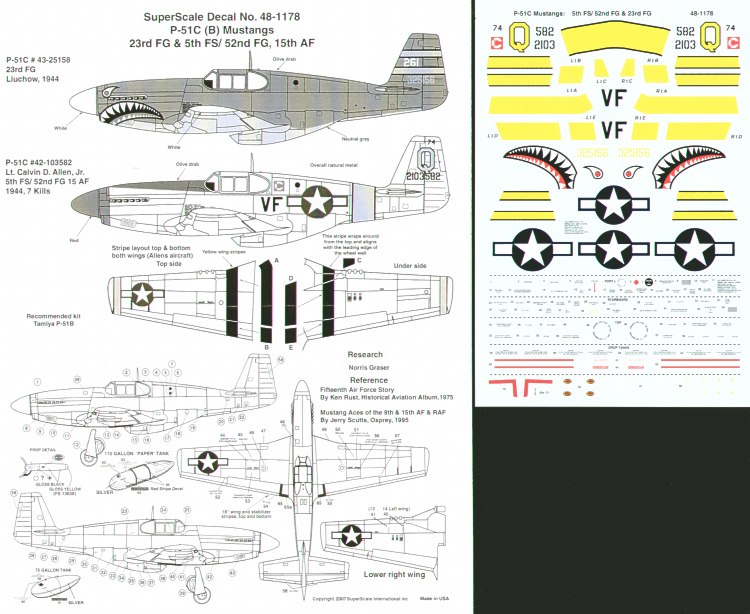 North-American P-51C Mustangs (2) 43-25158 23FG OD/grey with shark mouth; 42-103582 VF-Q 5FS/52FG 15th Air Force Lt Calvin D.Allen