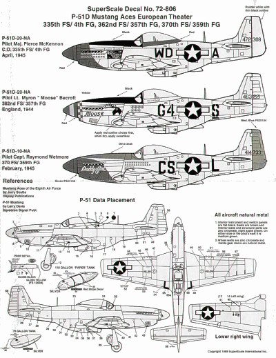 North-American P-51D Mustang Aces 8th Air Force (3) 472308 WD-A Maj Pierce McKennon CO 335FS/4FG 'Ridge Runner' red nose,white rudder; 463221 G4-S Lt M.Beecroft 362FS/357FG 'Moose' red/yellow nose; 414733 CS-L Capt Wetmore 370FS/359FG 'Daddys Girl' green nose,blue rudder. all natural metal