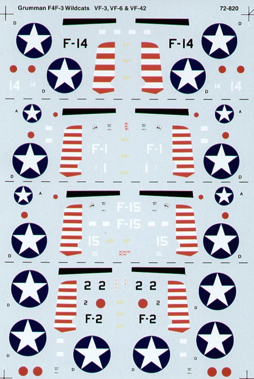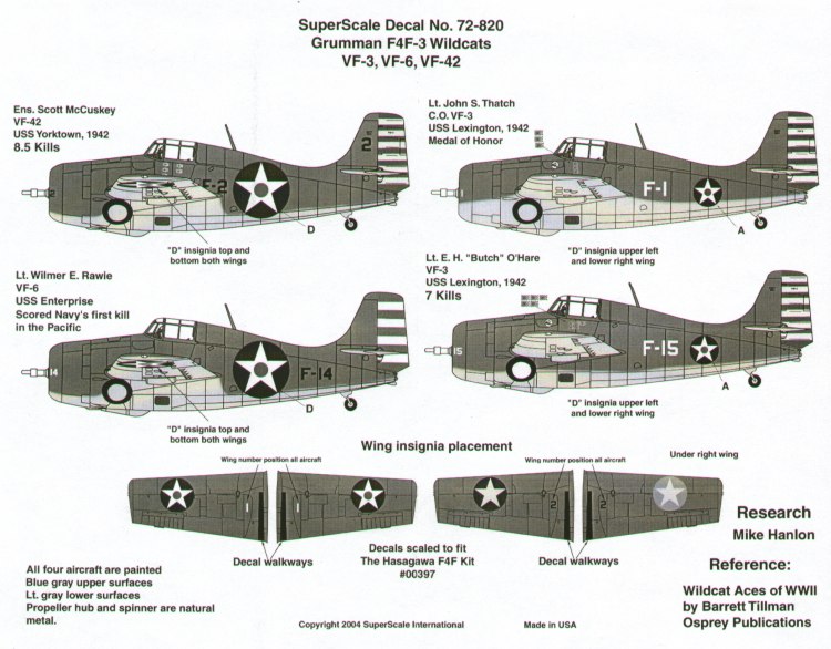Grumman F4F-3 Wildcat (4) F-2/2 VF-42 Ens Scott McCuskey USS Yorktown 8.5 kills; Grumman F-14 VF-6 Lt Wilmer E.Rawie USS Enterprise US Navy's first kill; both with large roundels. F-1 VF-3 CO Lt John Thatch; McDonnell F-15 VF-3 Lt Butch O'Hare 7 kills. Both USS Lexington, small roundels. All 1942 with blue/grey upper surfaces and red/white striped rudders