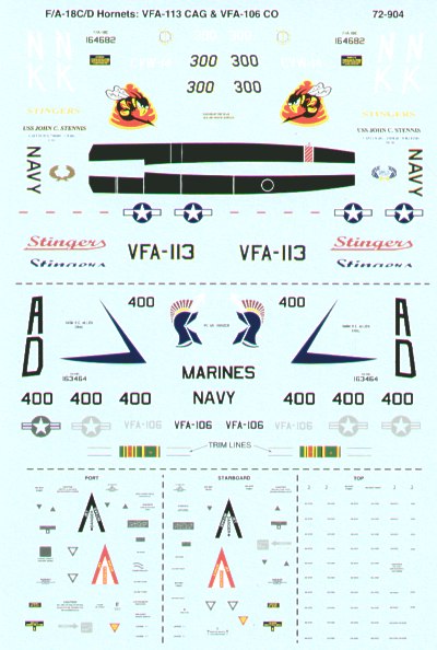 McDonnell-Douglas F/A-18C / F/A-18D Hornets (2) C 164682 NK/300 VFA-113 Stingers CAG Insignia blue fin USS Ronald Reagan; D 163464 AD/400 VFA-106 Gladiators