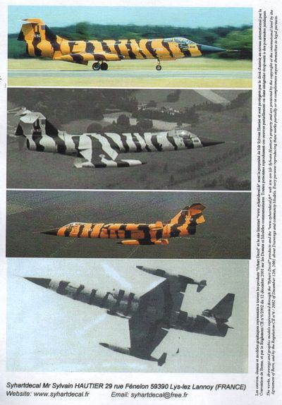 RE-PRINTED!!! Lockheed F-104G Starfighter FX-52 'Tigermeet 1978' 31Sqn. The decals set incluse all the marking and the tiger stripe permitting to release the first Belgian Tiger aircraft, and on of first special paint in Belgian Air Force. (severals decals and drawings already existing on market, but due missing informations, several contain of them contain mistakes and approximations.) This set is based on original pictures of the 1978 aircraft.