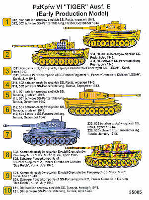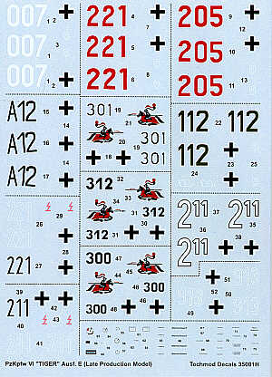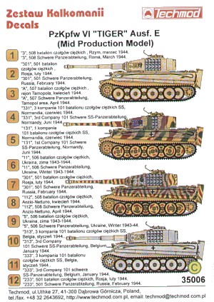 Techmod - TM35001 - 1:35 | Pz.Kpfw.VI Tiger Ausf.E Late production models. Camouflage & markings versions "007″, sSSPzAbt.101, Hauptsturmfƒ¼hrer Michael Wittmann, Normandy, August 1944 "205″, sSSPzAbt.101, Hauptsturmfƒ¼hrer Michael Wittmann, Normandy, June 1944 "112″, 1.Kompanie sSSPzAbt.101, Normandy, June 1944 "211″, 2.Kompanie sSSPzAbt.102, Normandy, June 1944 "300″, 505 sPzAbt., Lt. Roder, Poland, Summer 1944 "301″, 505 sPzAbt., Poland, Summer 1944 "312″, 505 sPzAbt., Poland, Summer 1944 "221″, 2.Kompanie sSSPzAbt.101, Normandy, June 1944 "221″, 2.Kompanie sSSPzAbt.102, Hauptsturmfƒ¼hrer Endemann, Normandy, June 1944 "A12″, 9.Kompanie, PzRgt., Panzer Grenadier Division "Groƒl¸deutschland", Eastern Front, September 1944 "913″, 9.Kompanie, Panzer Grenadier Division "Totenkopf", Poland, Summer 1944 "211″, 504 sSSPzAbt., Italy, June 1944 More | Military vehicle decals | Catalogue | £7.20 | ||