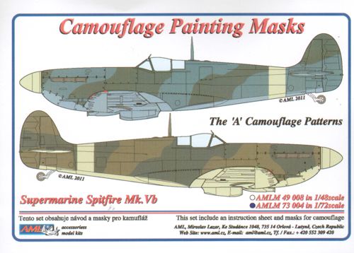 AML - AMLM73004 - 1:72 | Supermarine Spitfire Mk.V 'A' patterns camouflage pattern paint masks (designed to be used with Admiral, Airfix, AZ Models, Heller, Hobby Boss, Italeri, PM Model, Revell, Smer, Sword and Tamiya kits) [Mk.VB Mk.VC] More | Aircraft paint masks (self adhesive) | Catalogue | £2.20 | ||