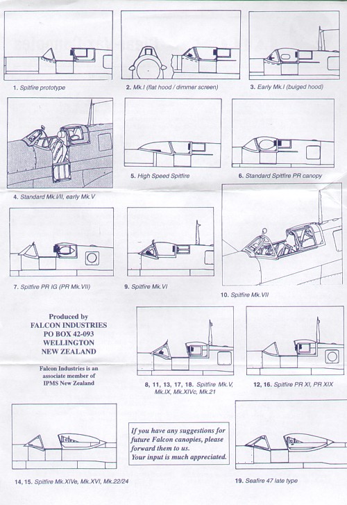 Falcon - FNCV4172 - 1:72 | Supermarine Spitfire Special: Supermarine Spitfire Prototype/early Mk.I (designed to be used with Tamiya kits) Supermarine Spitfire Mk.I with flat hood and dimmer screen (designed to be used with Tamiya kits) Supermarine Spitfire Mk.I early version with bulged hood and unarmoured windscreen) (designed to be used with Tamiya kits) Standard Supermarine Spitfire Mk.I/Supermarine Spitfire Mk.II/early Mk.V (in open position) (designed to be used with Tamiya kits) High Speed Supermarine Spitfire (designed to be used with Tamiya kits) Standard PR Supermarine Spitfire (designed to be used with Tamiya kits) Supermarine Spitfire PR.1G (PR.VII) (designed to be used with Tamiya kits) Supermarine Spitfire Mk.V with internal armour glass and blown hood (designed to be used with Tamiya kits) Supermarine Spitfire Mk.VI (designed to be used with Tamiya kits) Supermarine Spitfire Mk.VII/X (designed to be used with Hasegawa kits) Supermarine Spitfire Mk.VIII/IX (designed to be used with Hasegawa kits) Supermarine Spitfire PR Mk.XI (designed to be used with Ventura kits) Supermarine Spitfire Mk.XIVc (designed to be used with Fujimi kits) Supermarine Spitfire Mk.XIVe (designed to be used with Fujimi kits) Supermarine Spitfire Mk.XVI (designed to be used with Heller kits) Supermarine Spitfire Mk.22/24 (designed to be used with Ventura kits) Supermarine Spitfire PR Mk.XIX (designed to be used with Fujimi kits) Stfire Mk.21 AT Supermarine Spitfire Mk.V/Mk.IX (designed to be used with Italeri kits) Supermarine Seafire Mk.47 (late type) (designed to be used with Ventura kits) (designed to be used with Heller and Ventura kits) More | Aircraft canopies (vacform) | Catalogue | £12.99 | ||