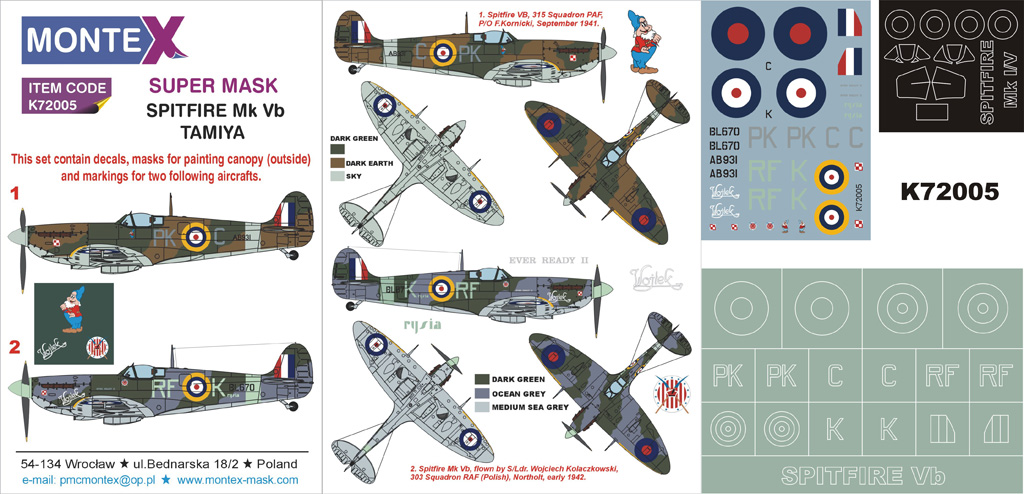 Montex - MXK72005 - 1:72 | Supermarine Spitfire Mk.Vb 1 canopy mask (exterior) + insignia and markings masks + decals (designed to be used with Tamiya kits) More | Aircraft paint masks (self adhesive) | Catalogue | £10.99 | ||