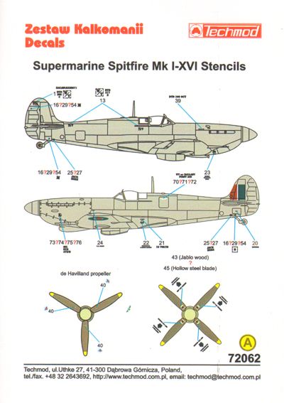 Techmod - TM72062 - 1:72 | Re-printed! Supermarine Spitfire Stencil Data for two aircraft. [Mk.I Mk.V Mk.VII Mk.VIII Mk.XVI etc] More | Aircraft decals (military) | Catalogue | £4.50 | ||