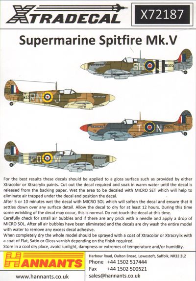 Xtradecal - X72130 - 1:72 | Supermarine Spitfire Mk.Vb (11) BM124 LO-W 602 Sqn 'Queen Salote' S/L B.E.F.Finucane RAF Kenley; BL351 BP-H 457(RAAF) Sqn S/L Johnny Gibson RAF Jurby; AA926 YO-E 401 (RCAF)Sqn 'Jersey'/ Marguerite, P/O I.C.Ormanston RAF Biggin Hill All Dk Green/Ocean Grey/Med Sea Grey; W3380 RN-J 72 Sqn 'Basuto' S/L D.F.B.Sheen DFC RAF Acklington Dk Green/Dk Earth/Sky; AB262 GN-B 249 Sqn Malta 1942 F/O Robert McNair Dk Earth/Tan/Med Blue; EP166 JU-N 111 Sqn S/Ldr P.R.W.Wickham 'O Bandeirante' 1942; W3843 YO-Q 401(RCAF) P/O Ibby Ibbotson RAF Redhill; AE-A 402(RCAF) Sqn S/L Godfrey Northcott RAF Merston 1943; BL370 SH-J 64 Sqn Flt/Lt Tony Cooper on D-Day RAF Harrowbeer. All Dk Green/Ocean Grey/Med Sea Grey. AB502 IR-G 246 Wing Wg.Cdr Ian Gleed Tunisia 1943 Dk Earth/Tan/Azure Blue; EP829 T-N 249 Sqn S/L Joseph Lynch (USA) Malta 1943 Dk Earth/Ex Dk Sea Grey or Dark Blue; More | Aircraft decals (military) | Catalogue | £7.99 | ||