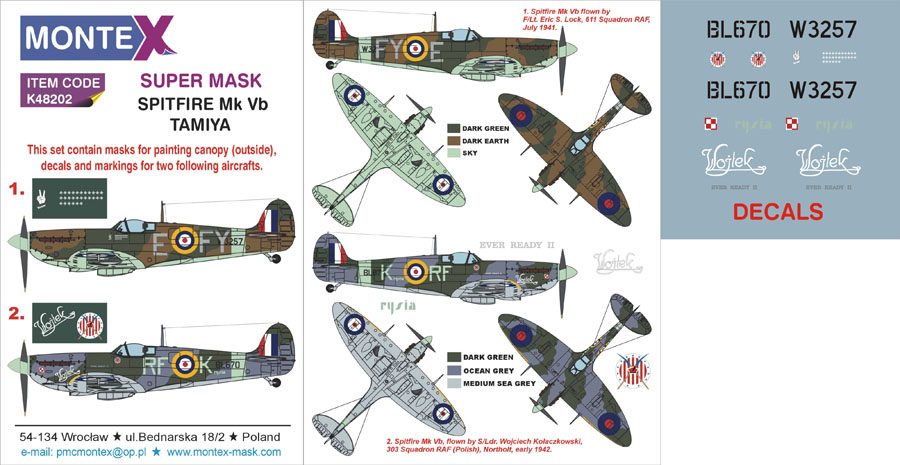 Montex - MXK48202 - 1:48 | Supermarine Spitfire Mk.Vb 1 canopy mask (exterior) + insignia and markings masks + decals (designed to be used with Tamiya kits) More | Aircraft paint masks (self adhesive) | Catalogue | £10.99 | ||