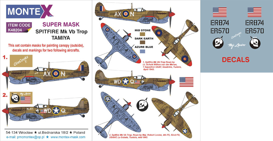 Montex - MXK48204 - 1:48 | Supermarine Spitfire Mk.Vb Trop 1 canopy mask (exterior) + insignia and markings masks + decals (designed to be used with Tamiya kits) More | Aircraft paint masks (self adhesive) | Catalogue | £10.99 | ||