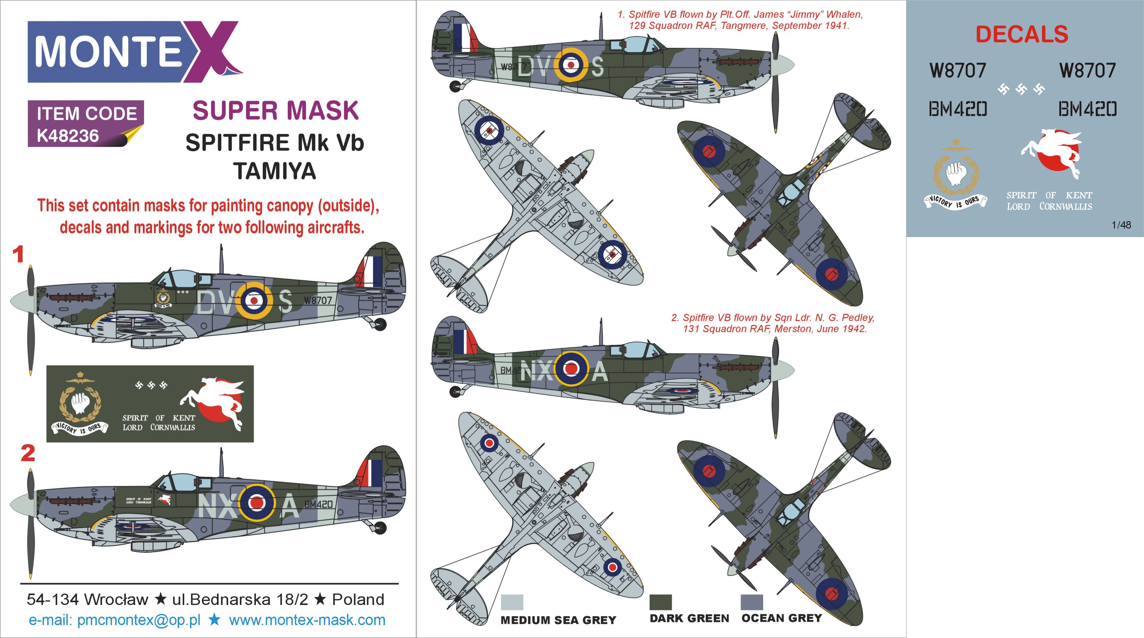 Montex - MXK48236 - 1:48 | Supermarine Spitfire Mk.Vb 1 canopy mask (exterior) + insignia and markings masks + decals (designed to be used with Tamiya kits) More | Aircraft paint masks (self adhesive) | Limited Availability | £11.50 | ||