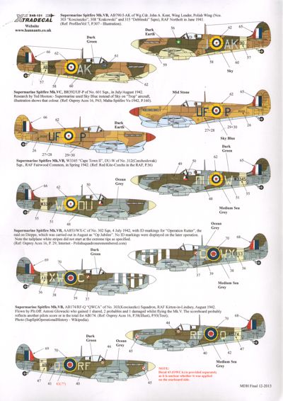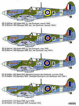 Techmod - TM48005 - 1:48 | Re-printed! Supermarine Spitfire Mk.Vb (4) BM144 RF-D 303 Polish Sqn three versions 3/1942, 5/1942, late 1942; W3207 JH-M 317 Sqn More | Aircraft decals (military) | Catalogue | £7.20 | ||