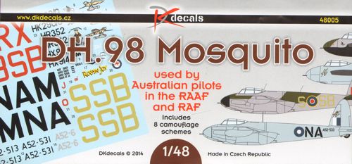 DK Decals - DKD48005 - 1:48 | Re-printed! de Havilland 98 Mosquito of Australian pilots in RAAF and RAF (8 camouflage schemes) 1/ Mosquito F.B. Mk.VI A52-533, No.1 Sq. RAAF, Borneo 1945 2/ Mosquito F.B. Mk.VI A52-513, No.1 Sq. RAAF, Borneo 1945 3/ Mosquito F.B. Mk.VI A52-531, No.1 Sq. RAAF, Borneo 1945 4/ Mosquito P.R. Mk. 40 A52-6, No.87 Sq. RAAF, Coomalee Creek 1944 5/ Mosquito PR Mk.XVI A52-619, No.87 Sq. RAAF, Australia 1945 6/ Mosquito F.B. Mk.VI HX914, No.464 Sq. RAF, December 1943 7/ Mosquito F.B. Mk.VI HR352, No.464 Sq. RAF, March 1945 8/ Mosquito Mk.XVII HK290/G, No.456 Sq. RAF, Ford, 1944 More | Aircraft decals (military) | Catalogue | £18.40 | ||