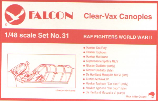 Falcon - FNCV3148 - 1:48 | RAF Fighters WWII. Hawker Sea Fury FB.11 (designed to be used with Hobbycraft kits) (we do not know how well this fits to the new Airfix kit yet sorry) Hawker Typhoon Mk.IB (designed to be used with Monogram kits) Hawker Hurricane Mk.I/Mk.II (designed to be used with Airfix and Hobbycraft kits) Supermarine Spitfire Mk.V (designed to be used with Tamiya kits) Gloster Gladiator (early) (designed to be used with Inpact, Lindberg and Pyro kits) Gloster Gladiator (late) (designed to be used with Inpact, Lindberg and Pyro kits) de Havilland Mosquito Mk.VI (late) (designed to be used with Airfix kits) Curtiss Mohawk IV (designed to be used with Hobbycraft kits) Hawker Typhon 'Car Door' (early type) (designed to be used with Monogram kits) Hawker Typhon 'Car Door' (late type) (designed to be used with Monogram kits) de Havilland Mosquito Mk.VI (early) (designed to be used with Airfix kits) More | Aircraft canopies (vacform) | Catalogue | £12.99 | ||