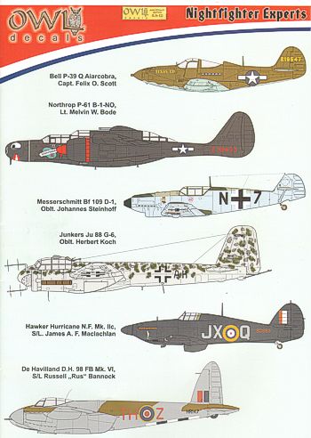 Owl - OWL48014 - 1:48 | Nightfighters. Bell P-39Q Airacobra; Northrop P-61B Black Widow; Messerschmitt Bf-109D-1; Junkers Ju-88G-6; Hawker Hurricane Mk.IIC; de Havilland Mosquito Mk.VI More | Aircraft decals (military) | Catalogue | £15.99 | ||