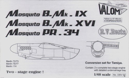 Valom - VALDSV02 - 1:48 | de Havilland Mosquito Mk.IX/Mk.XVI and PR.34. 2 stage engine. (designed to be used with Tamiya kits))[Mk.VI / NF.II Mk.IV / PR Mk.IV] More | Aircraft conversions (resin) | Catalogue | £31.70 | ||