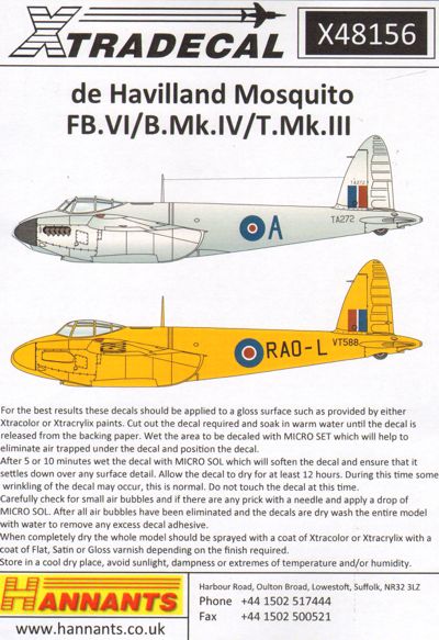 Xtradecal - X48156 - 1:48 | de Havilland Mosquito T.Mk.III, B.Mk.IV, FB.Mk.VI, (7) Mosquito T.Mk.III TV970 FK-V20 Sqn RA Wittering 1946; T.3 VT588 608 Sqn RAF Manston 1948; F.8 USAAF 334926 The Spook, Major Setchell 3rd PG (Reccon) Tunisia 1943; B.Mk.IV TA272/A Unknown Sqn Far East 1945; FB.Mk.VI RF838 EO-A 404 Sqn RAF Banff 1945; FB.Mk.VI RS623 VV-A 235 Sqn RAF Banff 1945; FB.Mk.VI HR399 OB-R 45 Sqn India 1945; More | Aircraft decals (military) | Catalogue | £7.99 | ||
